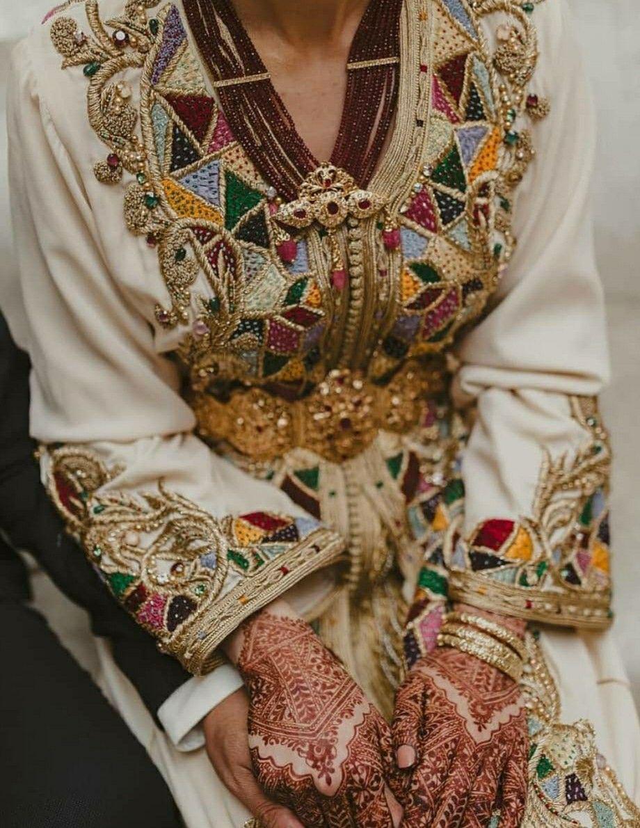 Kaftan: The Kaftan is a long, flowing gown worn by women, often made from luxurious fabrics such as silk or velvet. It is typically worn for special occasions and is characterized by its vibrant colors and elaborate patterns. The Kaftan is often worn with a wide belt, called a “mdamma,” which is adorned with jewels or embroidery.